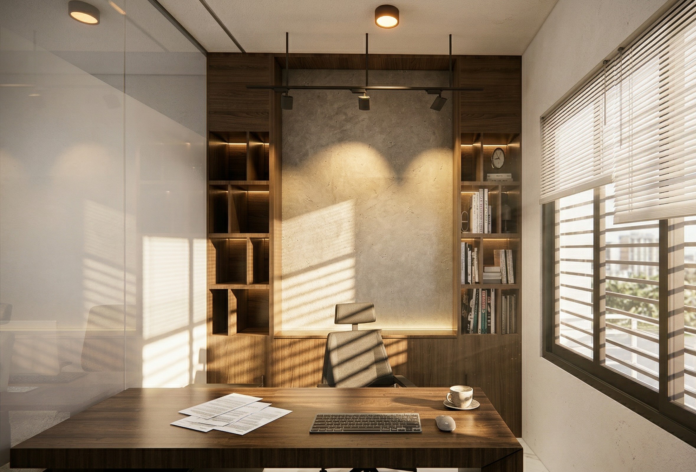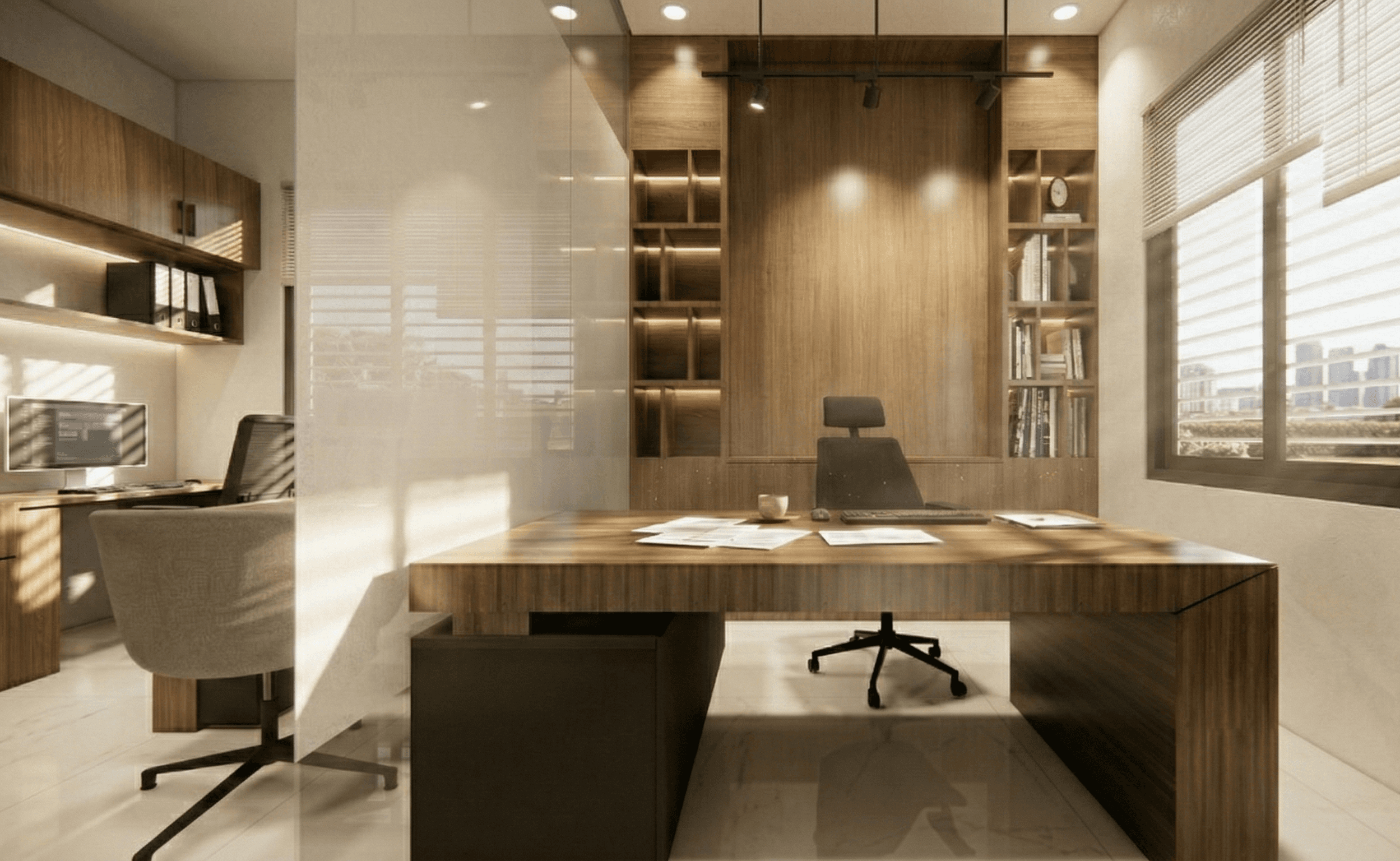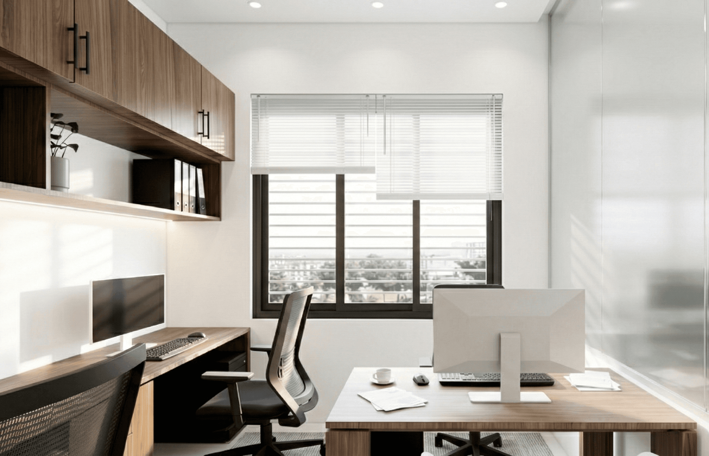 A 150 sqft home office carved out inside a duplex house in Bogura for Shahriar Construction Ltd. Designed to feel separate from the home while staying within it, with a clean professional setup that works all day.