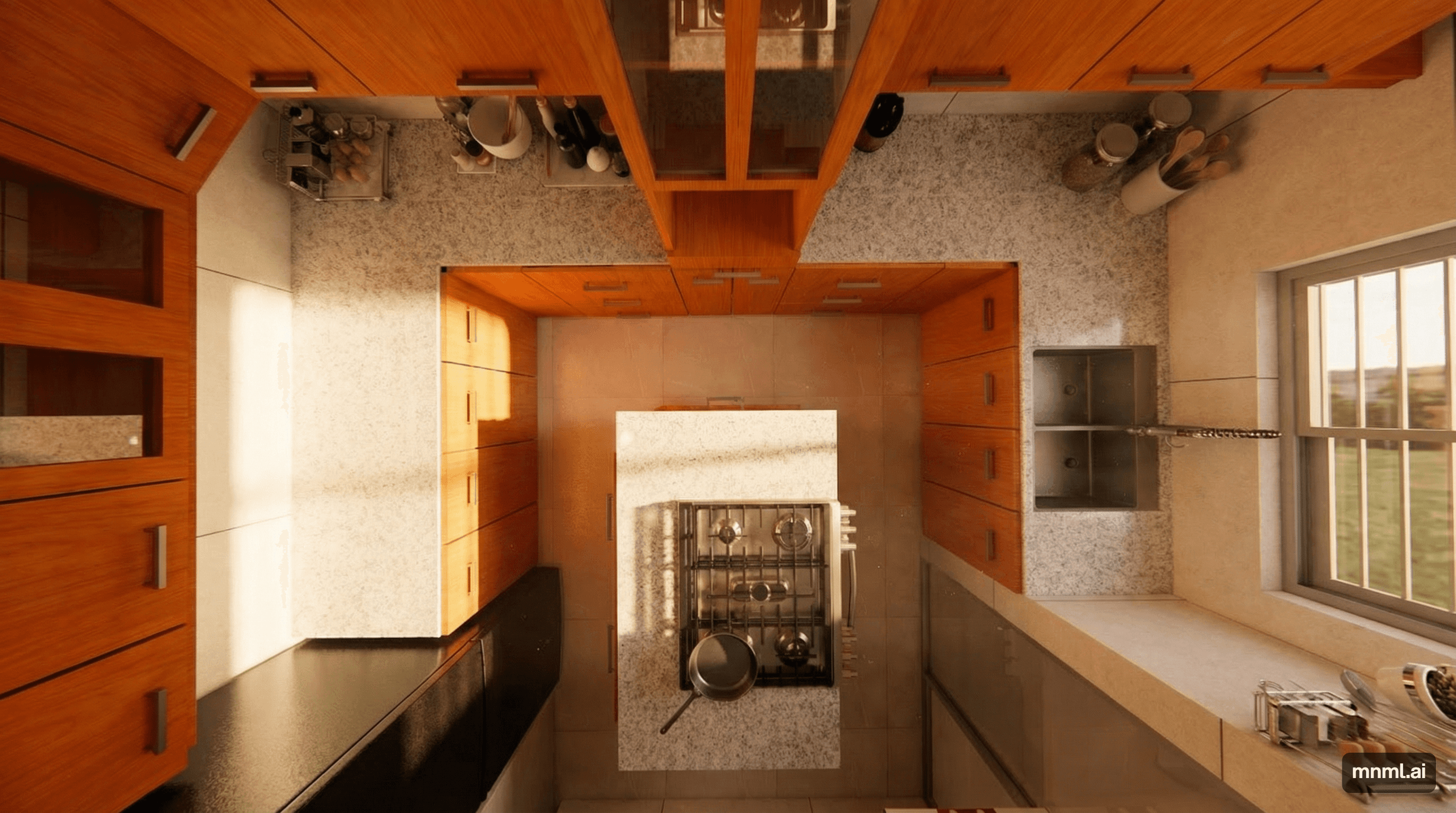 A 200 sqft kitchen in Uttara, Dhaka, redesigned around a central stove layout with custom cabinetry and optimised counter space on both sides. Practical, clean, and built around how people actually cook.